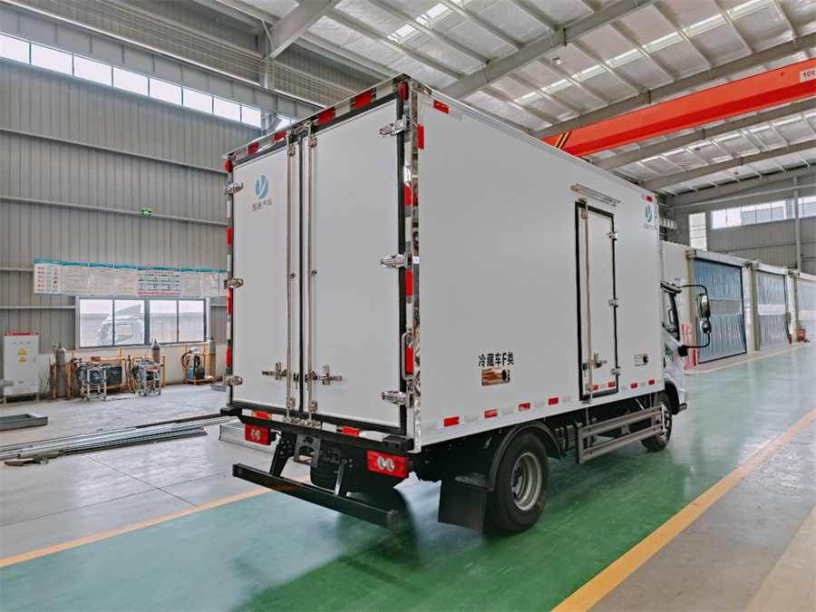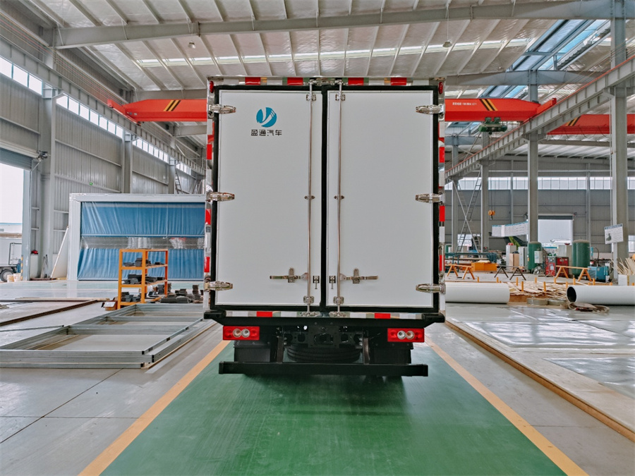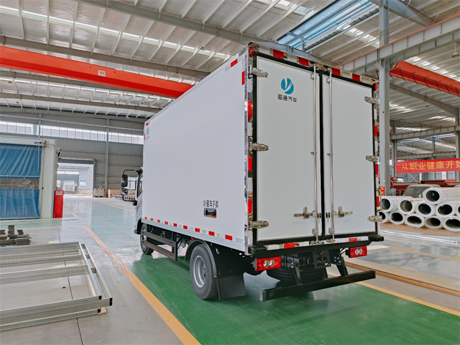 廂體采用內(nèi)外玻璃鋼材料制作,中間夾層為高密度保溫材料,用真空復(fù)合一次成型,表面光潔平整,強(qiáng)度高,使用壽命長,廂體邊緣采用優(yōu)質(zhì)鋁合金包邊和專用密封膠處理,具有重量輕、保溫、密封效果好等特點(diǎn)。門框鎖件為不銹鋼材質(zhì),門四周用一次成型密封條密封,廂體外形平整美觀,車廂頂部加以雨檐,避免下雨天雨水對車廂的浸泡,延長廂體使用壽命,車廂內(nèi)配有人性化照明系統(tǒng)。穩(wěn)固性和氣密性是普通冷藏車廂體不可比的,并且具有質(zhì)量輕,抗沖擊力強(qiáng),無滲透等優(yōu)點(diǎn)。配備國產(chǎn)580制冷機(jī)組。